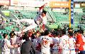 SK와 삼성의 경기가 1일 인천 문학구장에서 열렸다. 경기 전 2010시즌을 끝으로 선수생활을 마무리한 '캐넌히터' 김재현이 은퇴식을 가졌다. 김재현이 동료들에게 행가레를 받고 있다. SK의 한국시리즈 3차례 우승을 견인한 김재현은 걸출한 성적과 성실한 자세, 호쾌한 스윙으로 '캐넌 히터'라는 별명을 얻으며 야구팬에게 많은 사랑을 받았다. 인천=허상욱 기자 wook@sportschosun.com/2011.10.01/